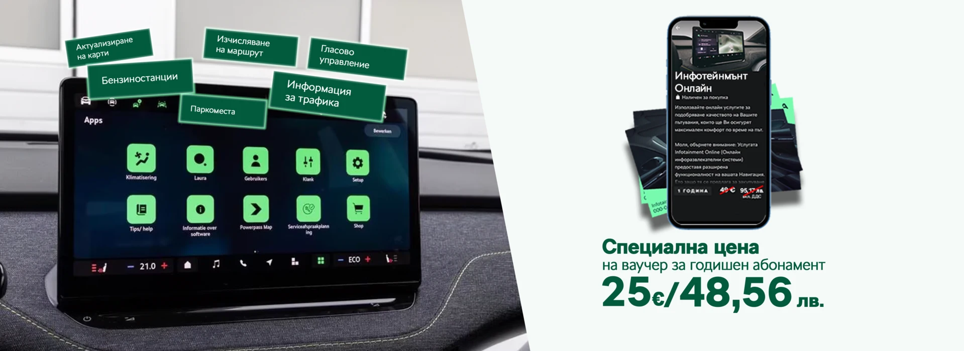 Възползвайте се от пълните възможности на Вашата инфоразвлекателна система като Калкулиране на Маршрут, Трафик информация, Гласов контрол, Бензиностанции, Гласово търсене на избрани точки, Зарядни станции, Online POI Search, Онлайн търсене на моите избрани точки, Паркоместа, Онлайн актуализиране на карти и още много.
